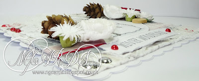 Snowflake Embellishment, Pinecones, Wooden Small Heart Button, 5mm Self Adhesive Red Pearls, Chrysanth White Kort & Godt, Red Rolled Flowers Kort & Godt, Colour Yourself Whtie Floribunda Roses, Vintage Blue Fluted Edge Sheer Ribbon, Venetian Red Seam Binding Ribbon, White Seam Binding Ribbon & Cheesecloth Fabric.